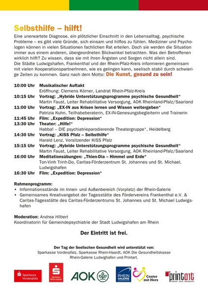 Unter dem Motto „DIE KUNST, GESUND ZU SEIN“ informieren die Städte Frankenthal, Ludwigshafen gemeinsam mit dem Rhein-Pfalz-Kreis seit über 20 Jahren zu unterschiedlichen Themen rund um die seelische Gesundheit.