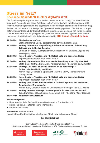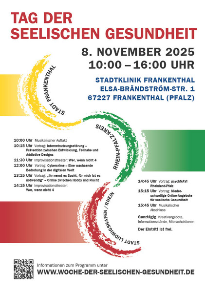 Die diesjährige Veranstaltung findet zum Thema „Stress im Netz? Seelische Gesundheit in einer digitalen Welt“ am Samstag, den 8. November 2025 von 10 - 16.00 Uhr in der Stadtklinik Frankenthal, Elsa-Brändström-Str. 1, 67227 Frankenthal statt.